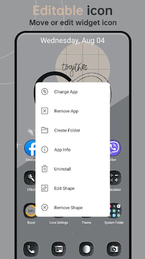 + When you press on icon in Love Launcher, you get context menu to edit icon, remove app, create folder, etc
