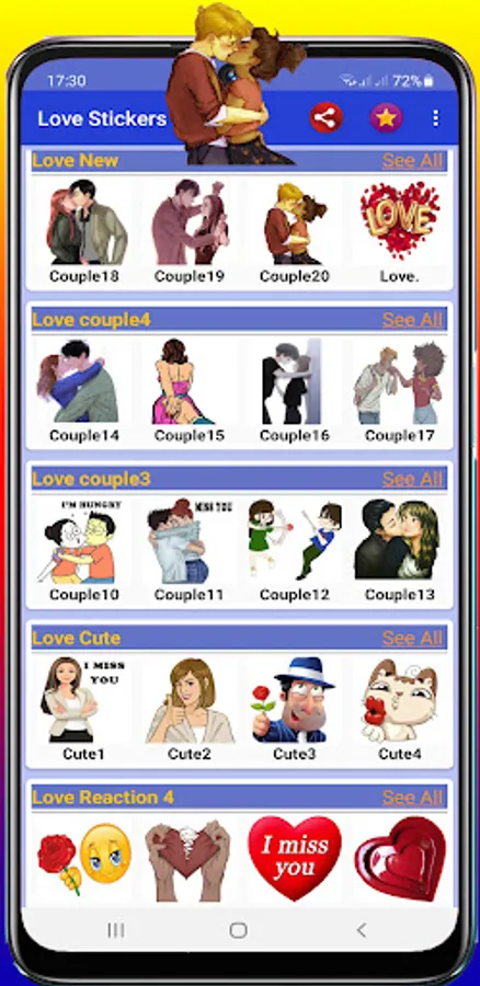 This new romantic stickers for WhatsApp app have a collection of emoji HD and couple stickers to add them to your chatting.