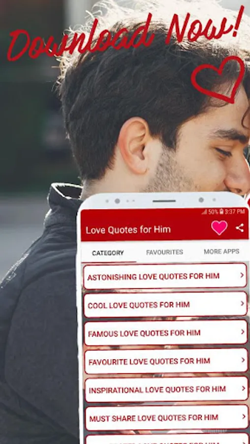 This Best Love Quotes for Him app helps your boyfriend and husband intimacy relationship get really deep and deeper. Sometimes you don’t know what to say and words just stuck on your lips. With this Best Love Quotes for Him, it will ease you and give you many ideal romantic love texts, beautiful love messages to share on many apps including Facebook, Twitter and Whatsapp.