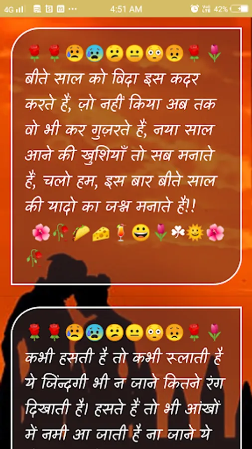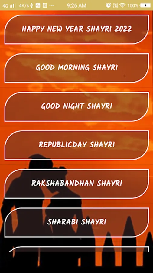 Apart from this we have included many categories in this app like Rakshabandhan Shayari Sharabi Shayari Navratri Shayari Friend Shayari Sad Shayari Attitude Shayari Emoji Shayari Funny Shayari Romantic Shayari God Shayari Happy Shayari maa shayari, baap shayari , intezar shayari, bewafa shayari, family shayari, utrayan shayari, cutness shayari, 2 line shayari, all in one, valentine shayari, valentine shayari, diwali shayari, chrismas shayari.