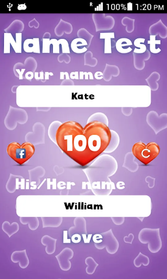 Enter the your name and the name of the person you love and the test will calculate the percentage and test your love by comparing your names and calculating your personal couple love match.(*1)