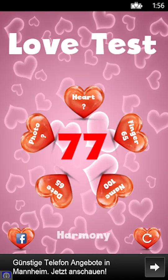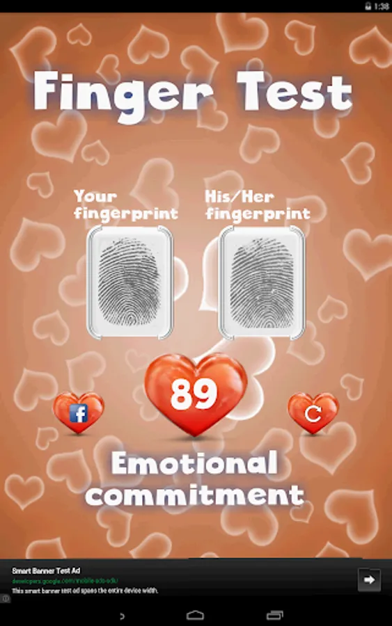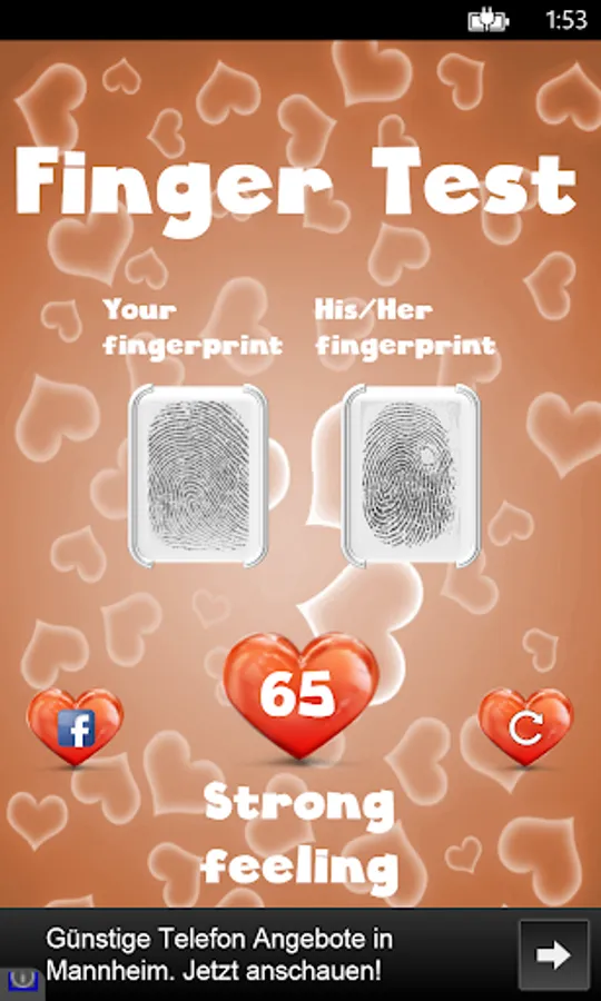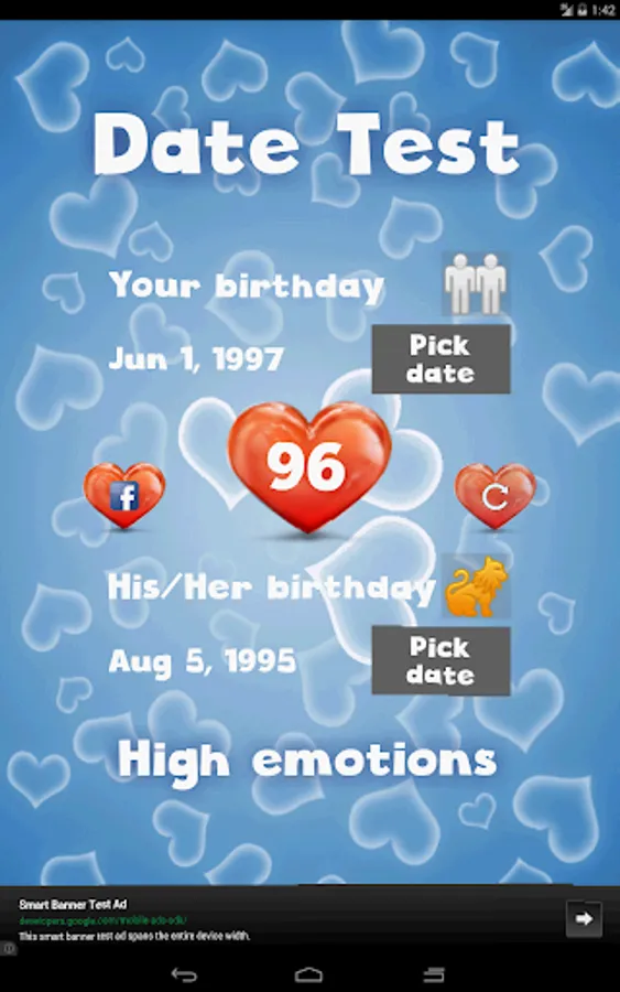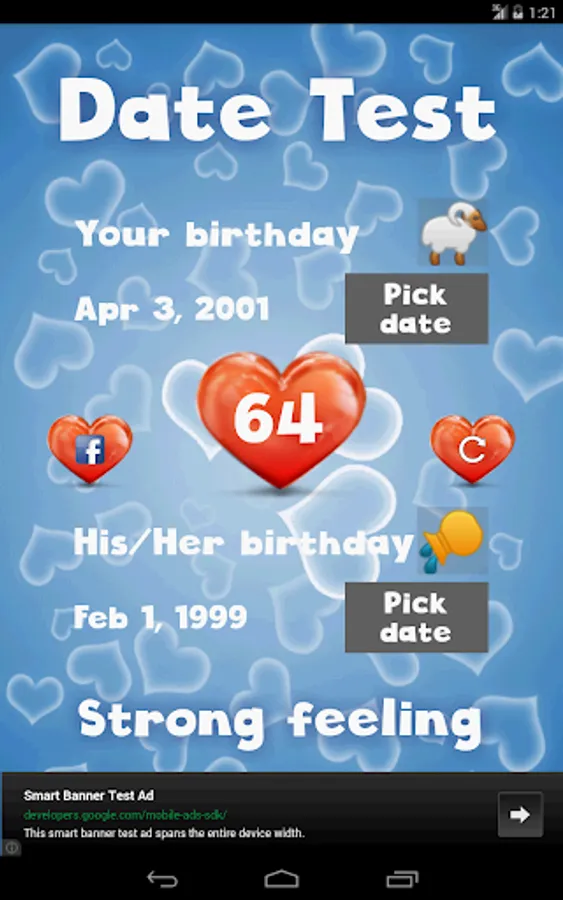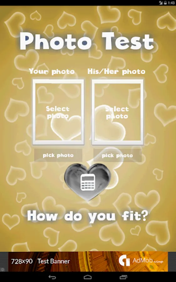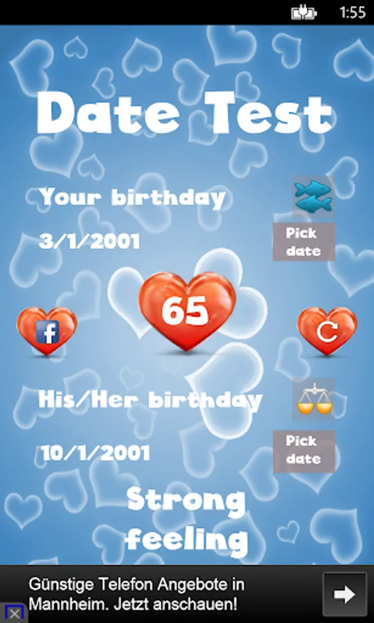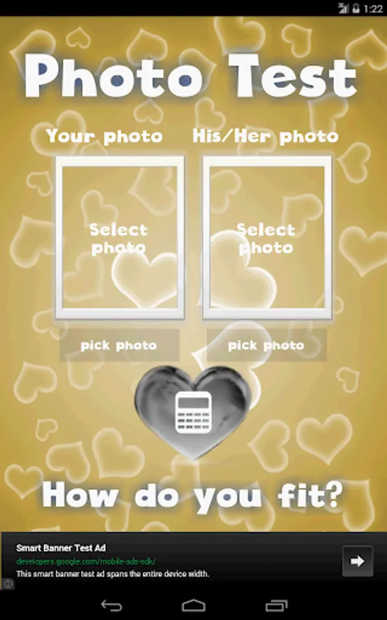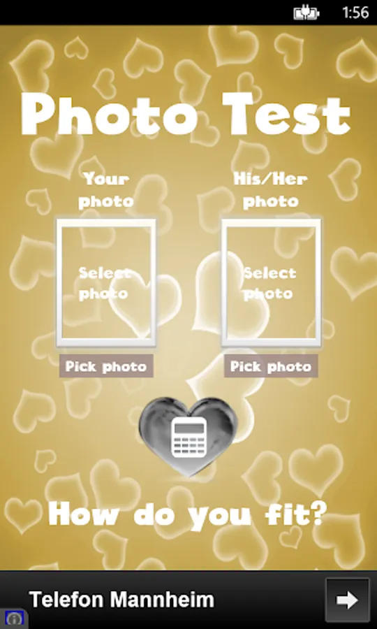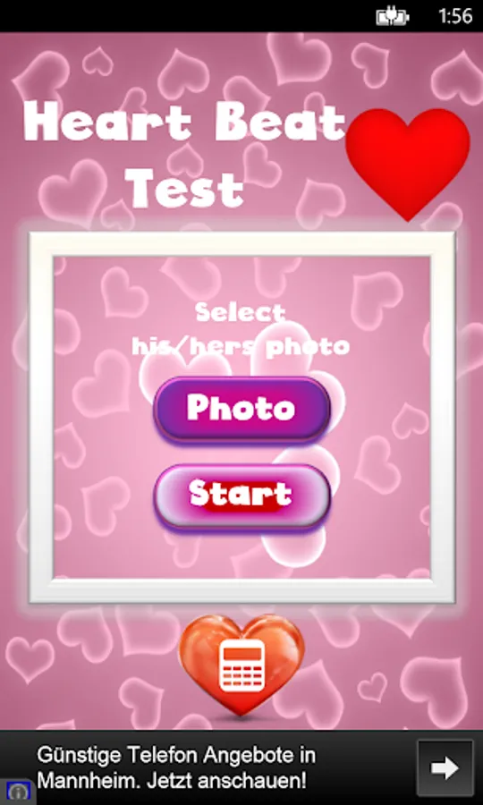 This is an advanced love calculator simulator (love meter)! It calculates the couples compatibility. You can check your compatibility by: finger scanner, photo match, name compatibility and date of birth (including a love horoscope). This innovative test also checks your feelings by measuring the beat of your heart.
