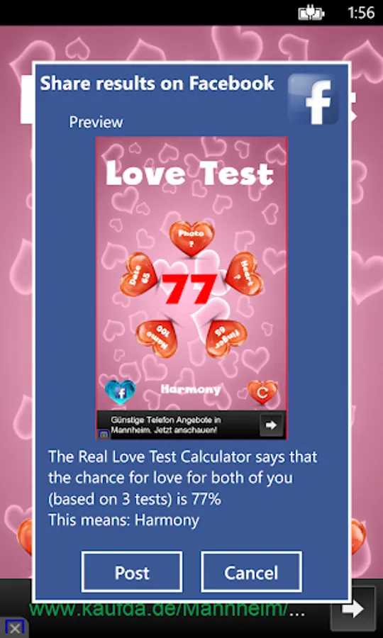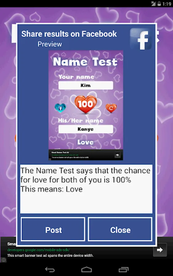 Share love calculator result with your partner or friends on social network.