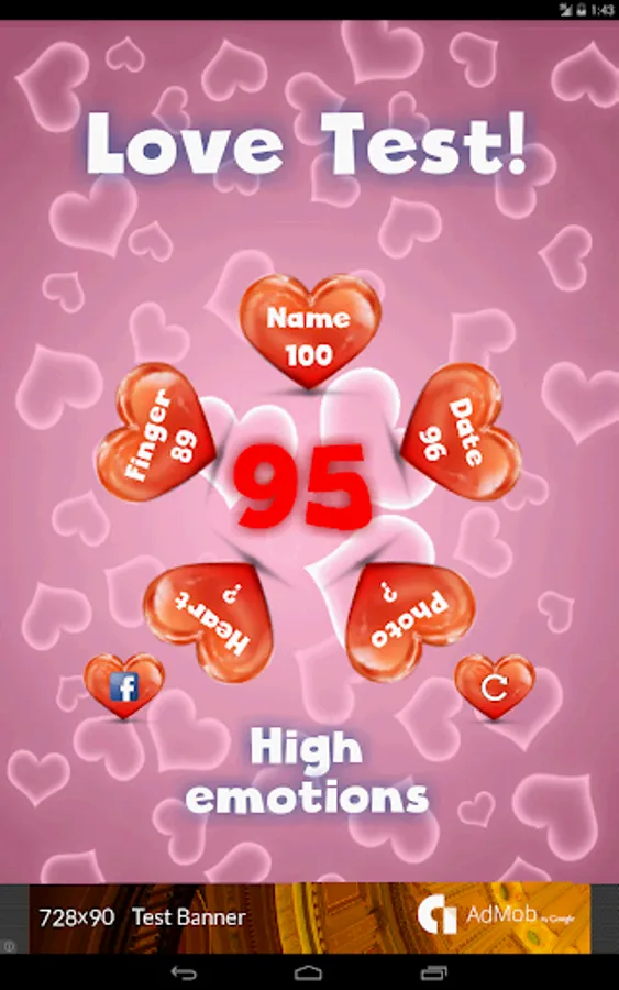 After performing all these tests a total score will be calculated for you and your love! That is new among love tests and better than simple love calculator. It's a good game for Valentine’s day.