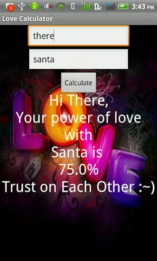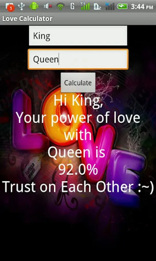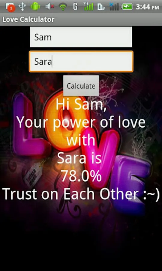 Sometimes you'd like to know if a relationship with someone could work out. Therefore 123LoveCalculator.com have designed this great application for you. With The Love Calculator you can calculate the probability of a successful relationship between two people. The Love Calculator is an affective way to get an impression of what the chances are on a relationship between two people.