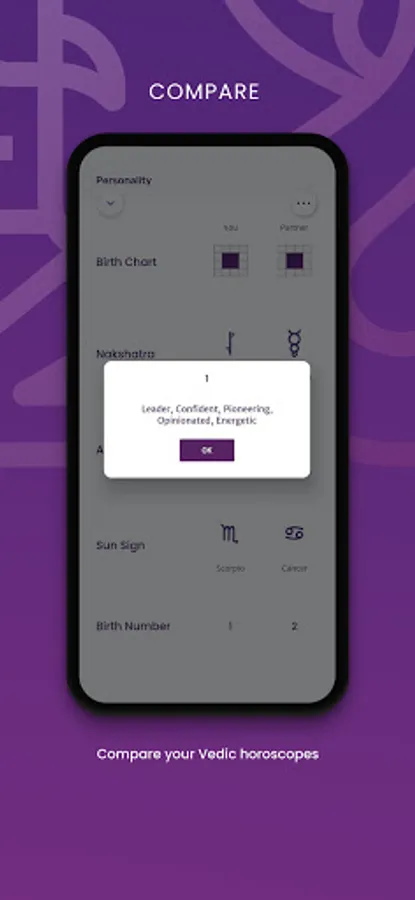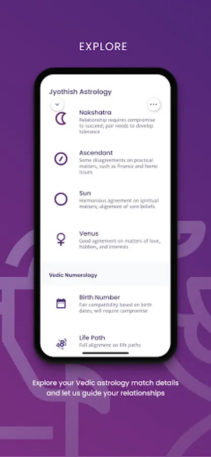 Our carefully formulated algorithm lets users view their personality and love, work and friend compatibility using 6 Jyotish/Vedic Astrology and Vedic Numerology measures.