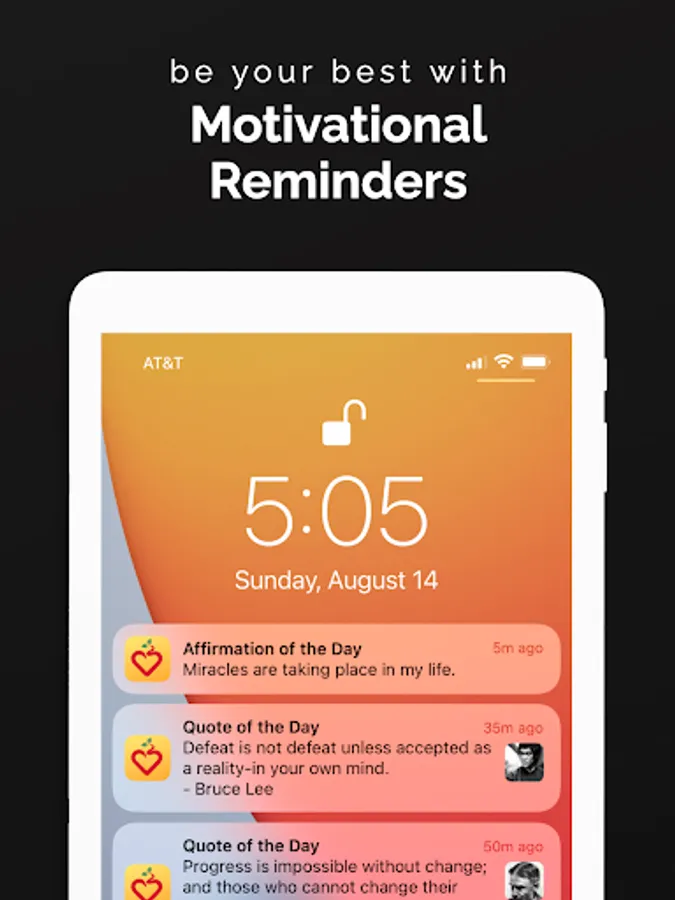 - Daily Inspirational Reminders: Daily positive quotes & affirmation reminders are effective ways to keep yourself going when times are tough and stay inspired when reaching new goals and dreams. Set the frequency at which you wish to receive your daily reminders