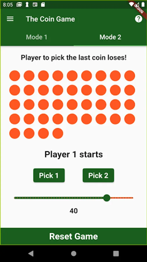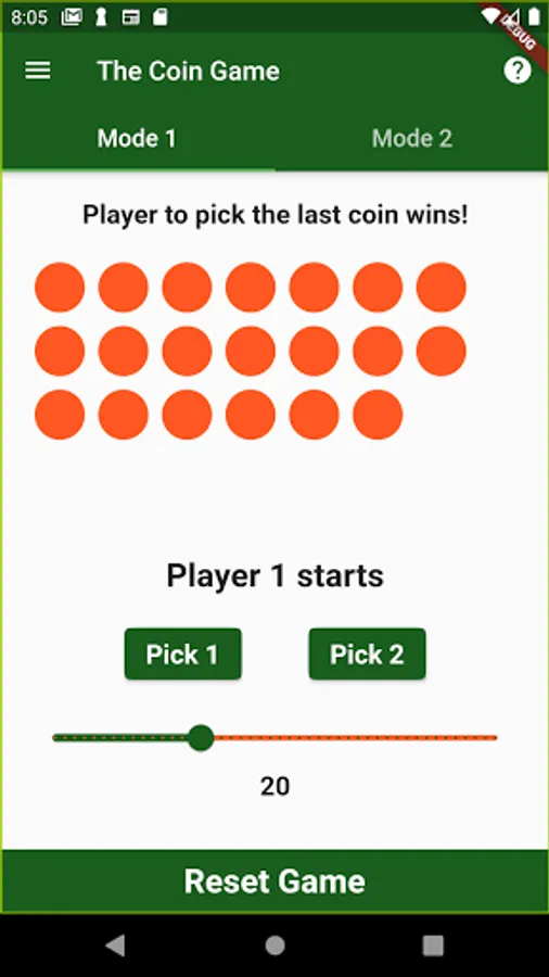 It's a multiplayer game which starts with a given number of tokens. Players take turns to pick 1 or 2 tokens. You have to strategically pick the tokens so that you pick the last token and win the game.