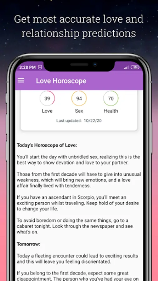 Does the universe affect your love life? Daily horoscope of love shows you how to make fun in love and build long-lasting romantic relationships with a partner, while compatibility test indicates your chances with a potential lover. If you’re still alone, this true horoscope app can hint you how to find and choose your soulmate.