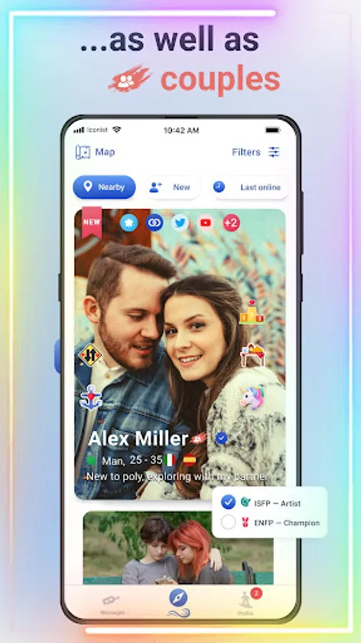 🏳️🌈 Iconist is designed as an alternative polyamorous dating app where you can express yourself with an eye-catching, detail-rich profile to find people locally or form long distance relationships.