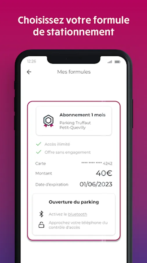 ◉ Buy the formula of your choice among monthly subscriptions and hourly tickets then simply pay in a few clicks, with your credit card. You can consult your current formulas at any time from the application menu.