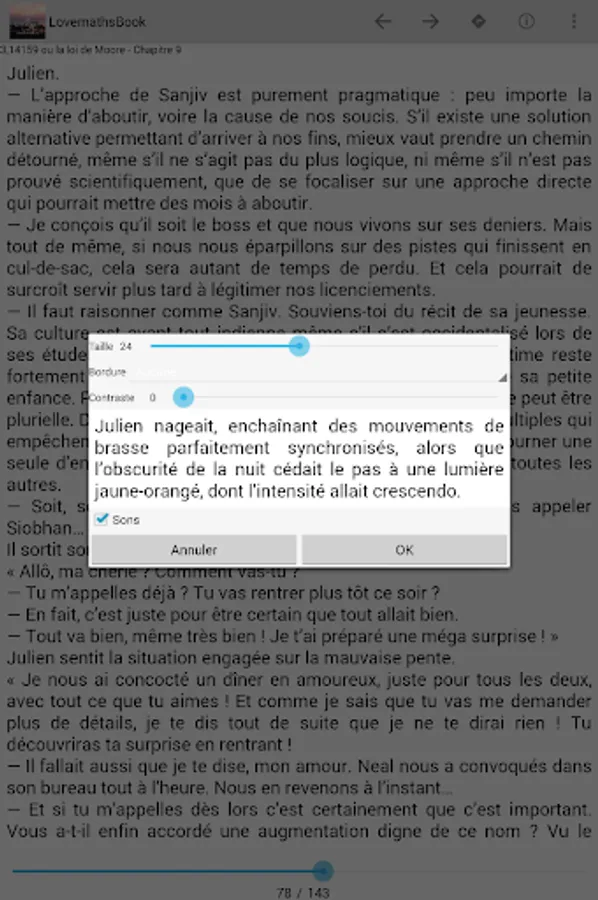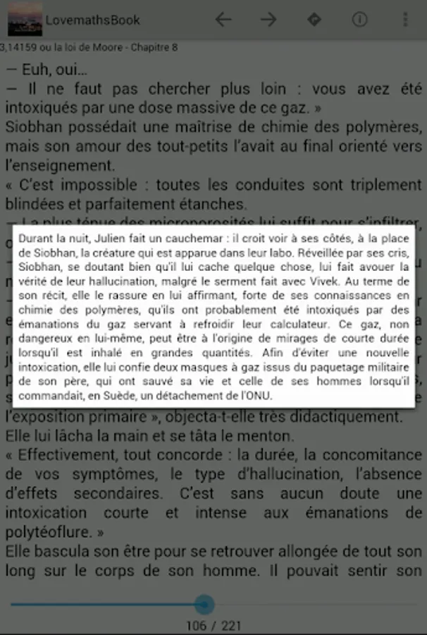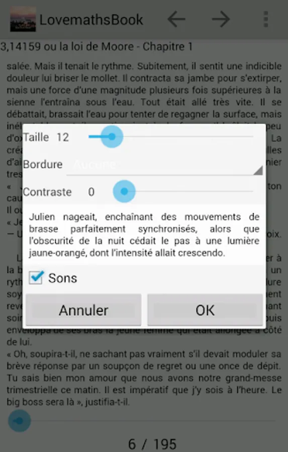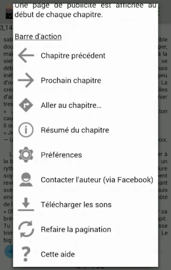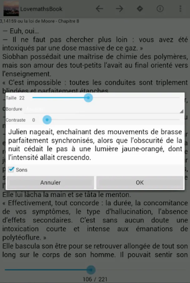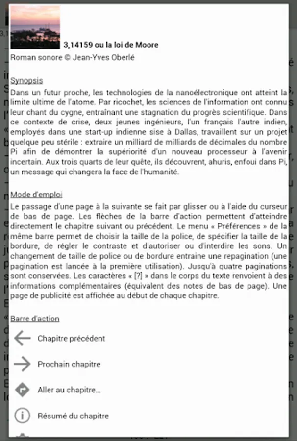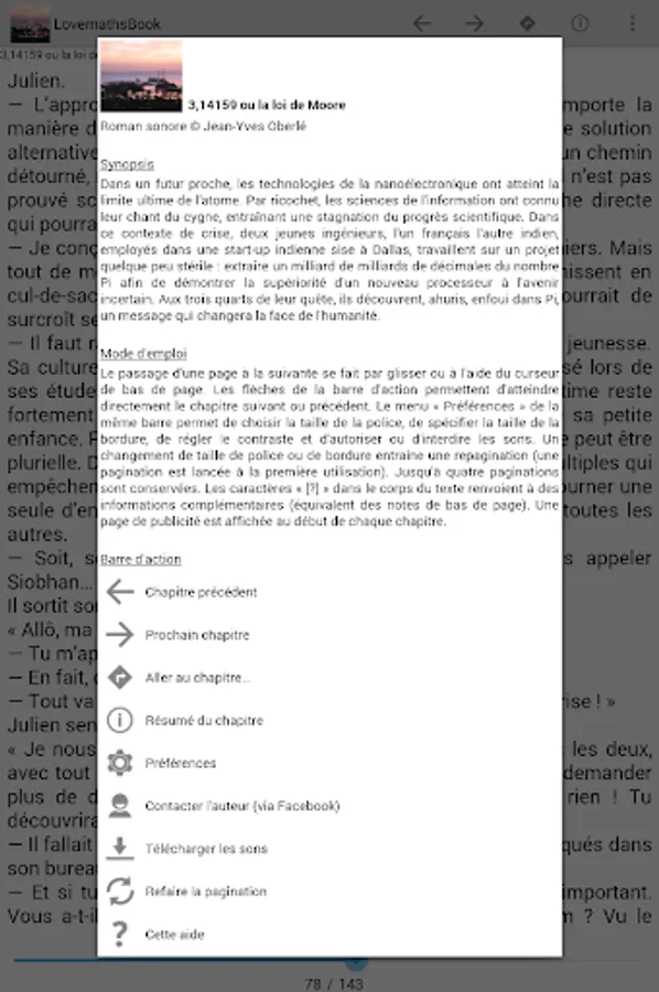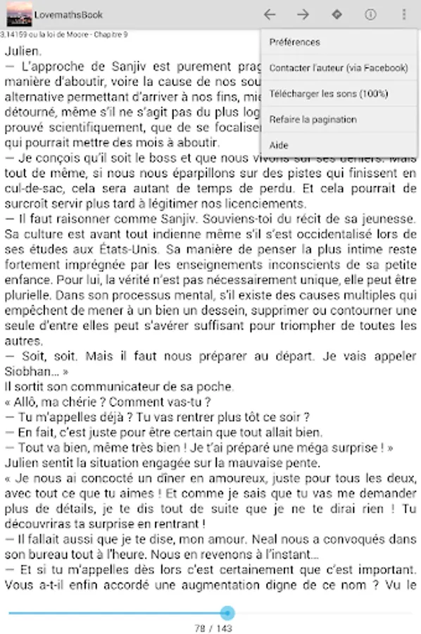 Discover the original novel of a French author in the form of a book with sound! The application integrates an e-reader that manages the sounds as the story progresses. Several options make it possible to configure the reading to make it as pleasant as possible. And for those in a hurry, a summary of each chapter is available on request!