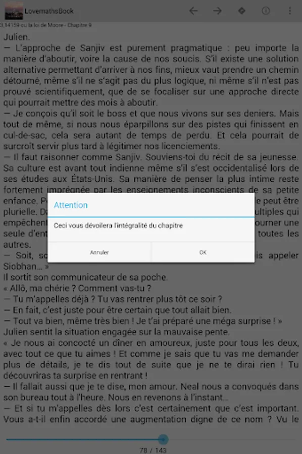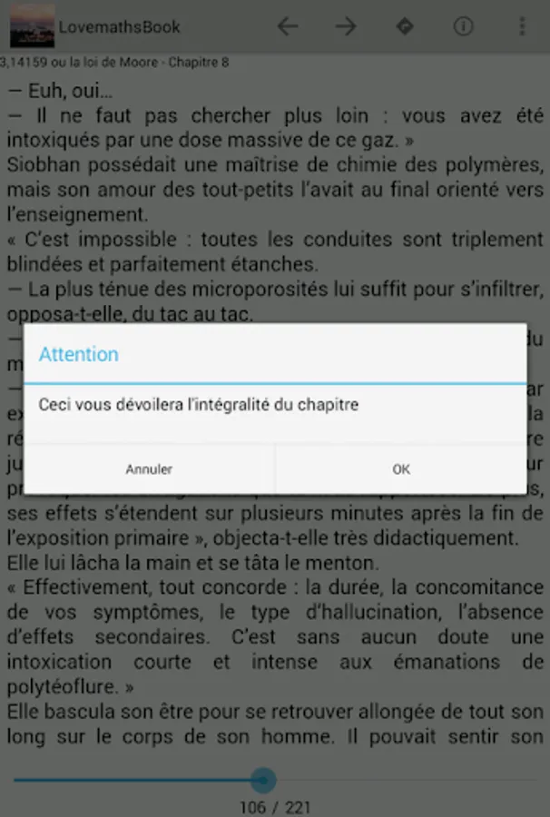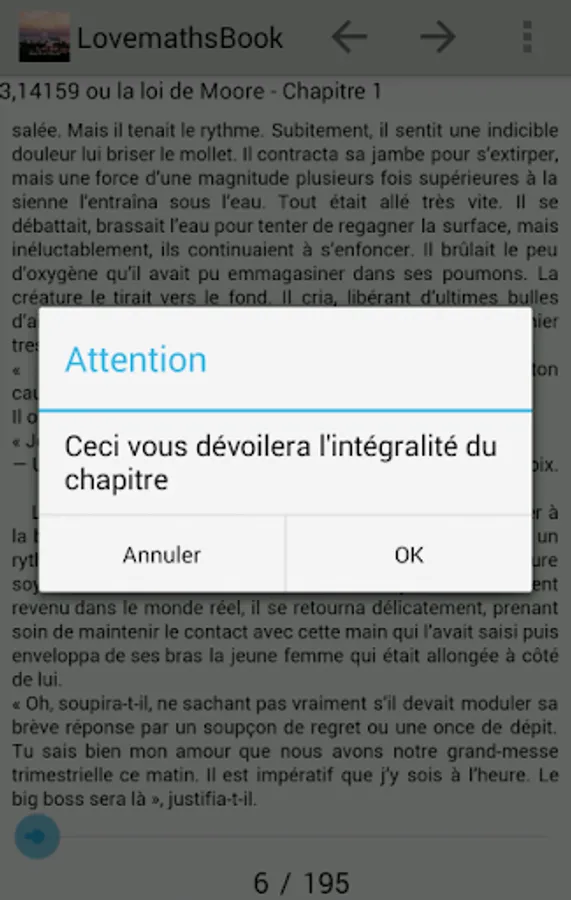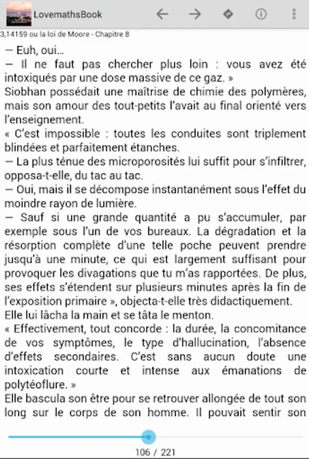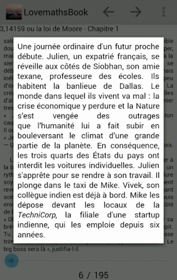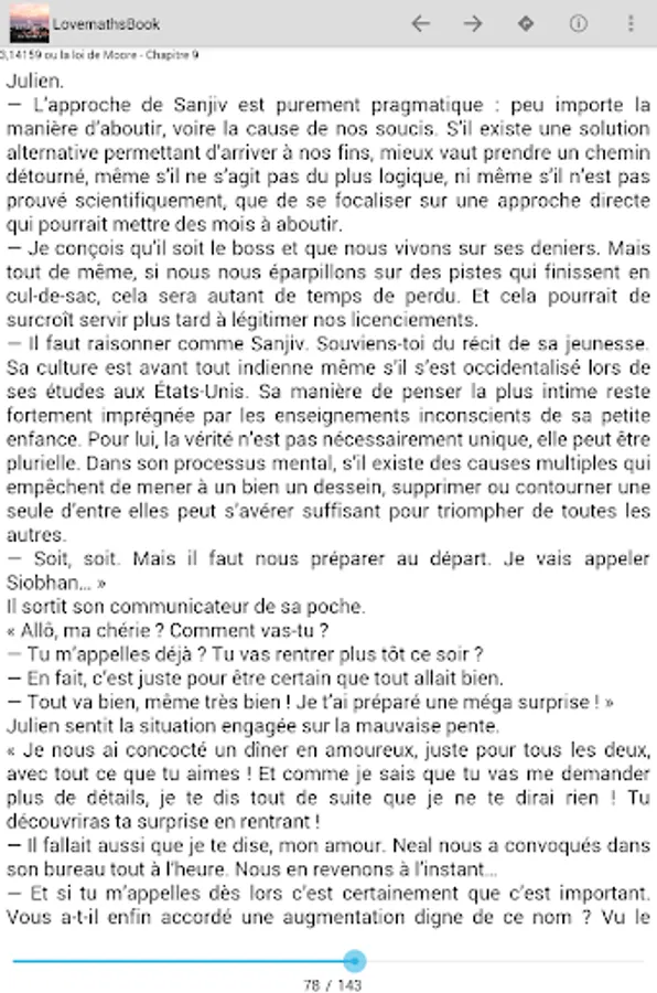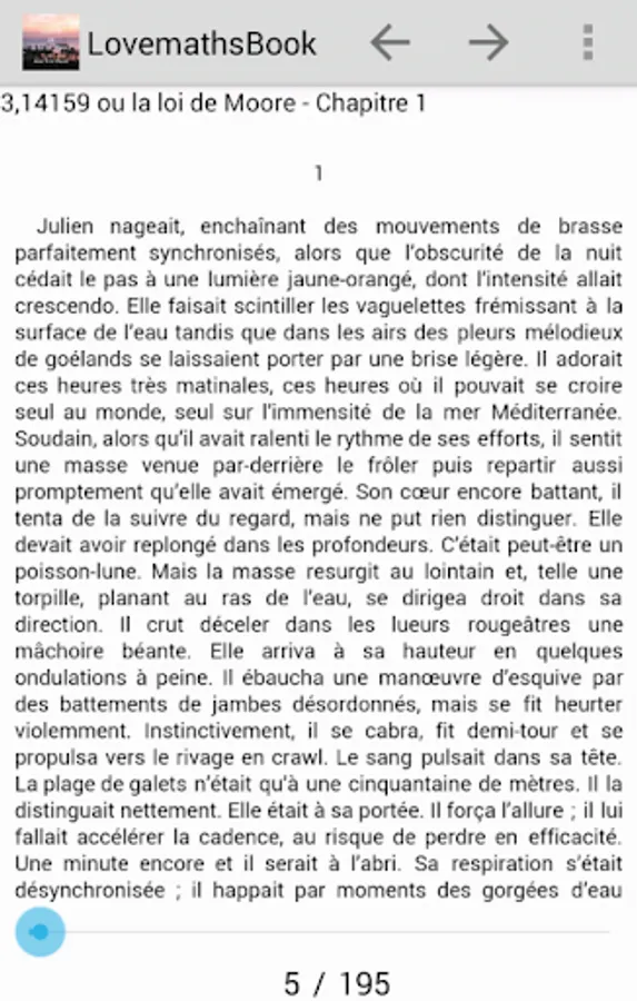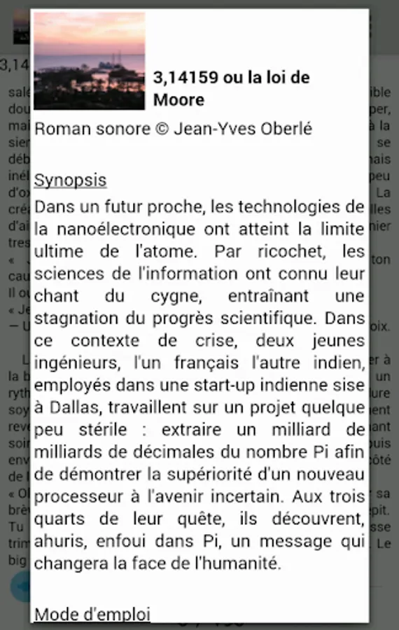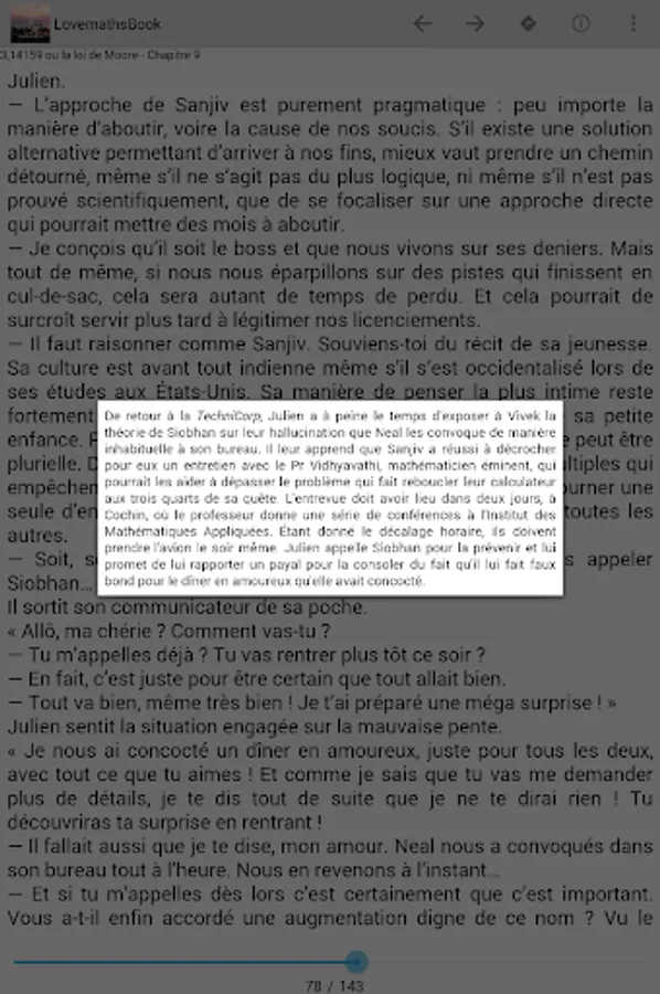 Discover the original novel of a French author in the form of a book with sound! The application integrates an e-reader that manages the sounds as the story progresses. Several options make it possible to configure the reading to make it as pleasant as possible. And for those in a hurry, a summary of each chapter is available on request!