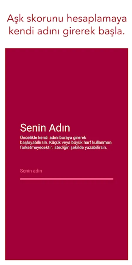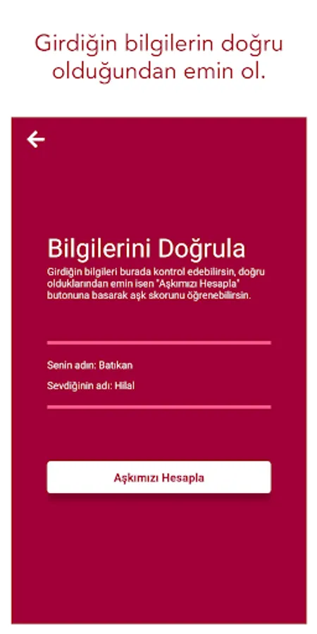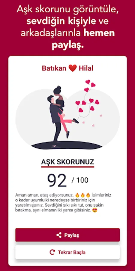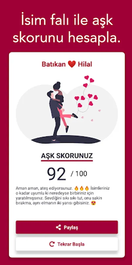 Your love score is created step by step. First, you can start by entering your own name. After entering your own name, you need to enter the name of the person you love. After entering the name of the person you love, you will see a screen where you can check all the information. When you press the "Calculate Our Love" button on this screen, your names will enter the fortune system that we have prepared. As a result of the operation in a few seconds your love result is calculated, so you see how many points your love will get over 100. A perfect opportunity to share this excitement with your loved ones. ❤️