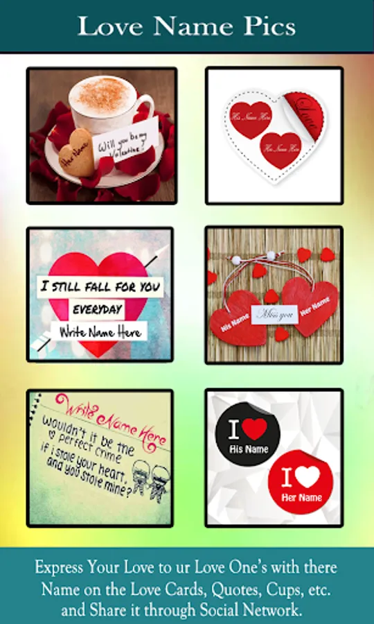In Love Name Pics you can write your name or your lover name or both on image according to theme and easily Share it on social networking platform.