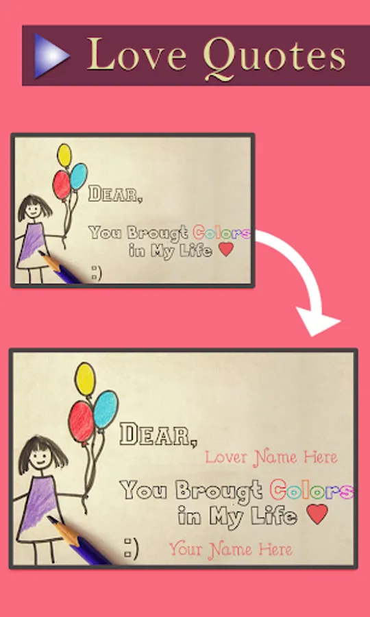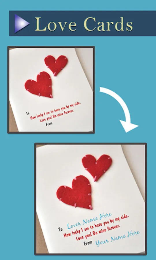 Now you can send a romantic and beautiful gift card to your partner anytime using this amazing Love Name Pics application. You can make greeting cards with any name. You can send special cards on special occasion to your lover or partner.