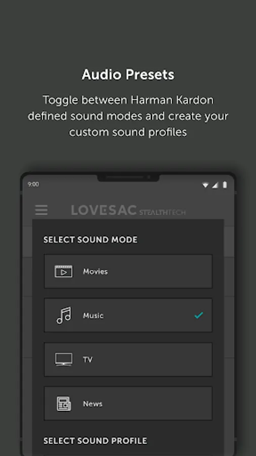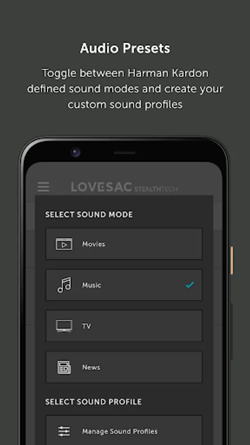 Choose from Harman Kardon defined tuning presets to pair with Movie, Music, TV, or News. Plus, adjust sound properties on your own to create and save custom presets.