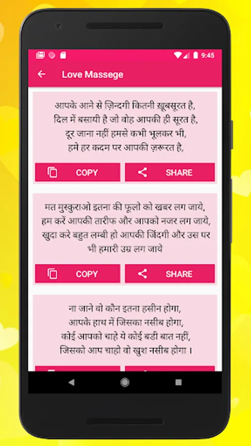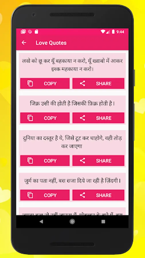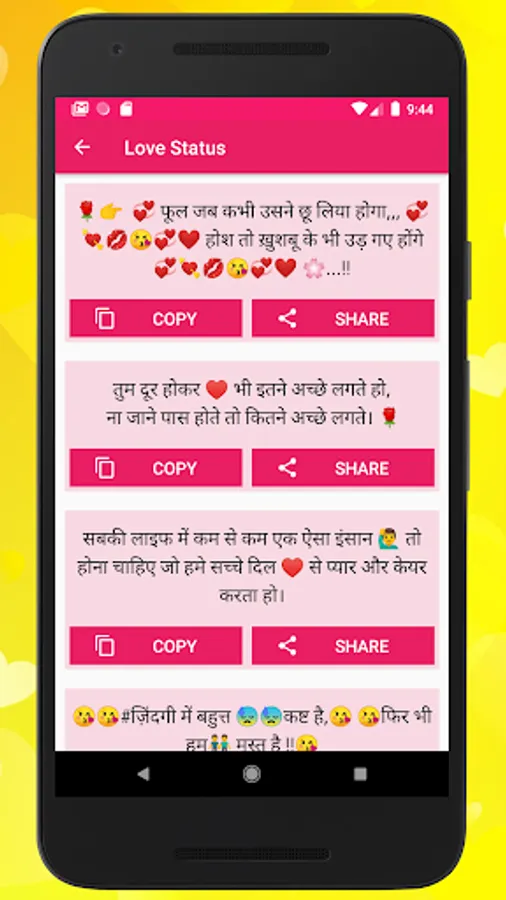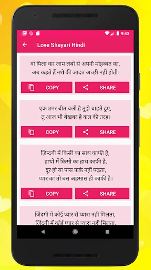 A lover can express their emotions to their girlfriend or Boyfriend in the form of Hindi Love Shayari. This type of Hindi love Shayari makes them happy & feel good. If you are looking for Shayari on love in Hindi for Whatsapp or Facebook, then our app is the best choice to get the latest Love Shayari Images, Love Status, Quotes & Messages. We also included Love captions for Instagram & Facebook in this app.
