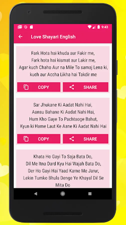 If you are in love with someone and looking for Love Shayari Images in Hindi then this Love Shayari Image app will be helping you to find Shayari on love. Romantic Love Shayari is always the first choice of a lover for sending their Girlfriend & Boyfriend. They use Love Hindi Shayari as on their Whatsapp Status.