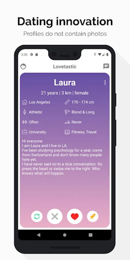 The goal of Lovetastic is that other users like you without a photo at first impression. This is possible because Lovetastic profiles contain a lot of exciting information. So even without a photo you can imagine how well a user matches you. If you have a match, you will enter the private chat. There you have the possibility to exchange pictures. Our unique matching ensures that you get to know exactly the people who make your heart beat faster.
