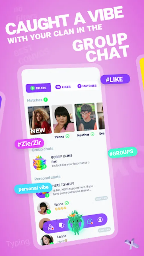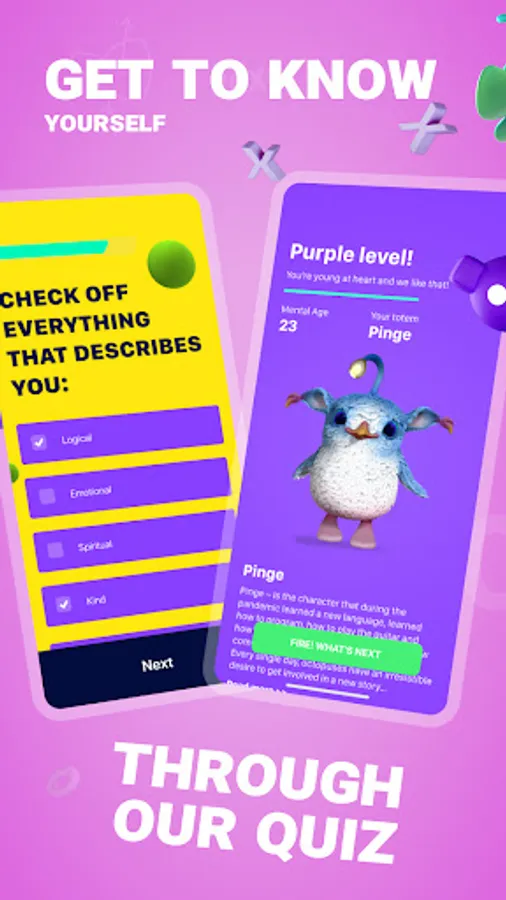 Look deep into your mind and heart through a quiz. Discover yourself through a cute virtual totem that helps people see you from new angles. Use our estimate of your mental age as a different way to describe yourself. Get to know people of all backgrounds, genders, sexualities, and appearances that you connect on another level with. Customize and take care of your totem. Become a part of the community in chats assembled by personality type. Play through our challenges, show off your achievements. Build new experiences at the intersection of romance, sex, friendship, and camaraderie.