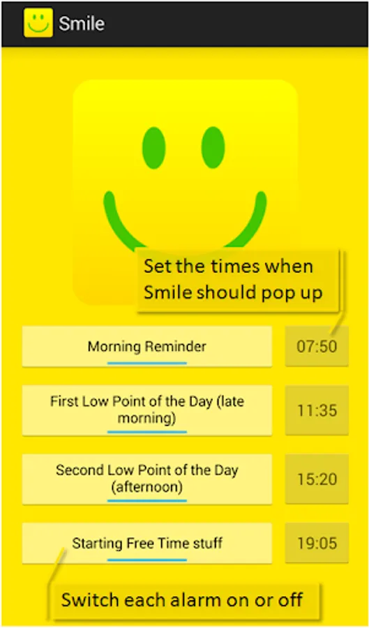 + You can select the times when Happy is supposed to pop up on the screen when you open the app manually.