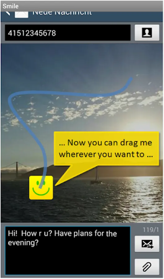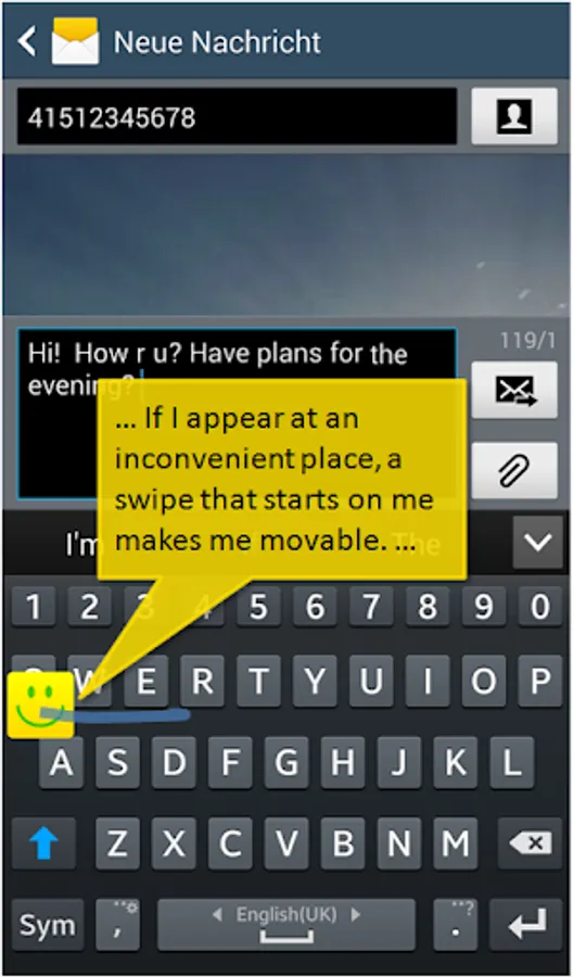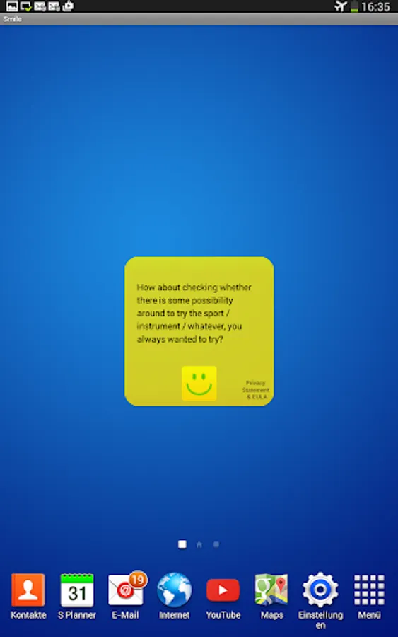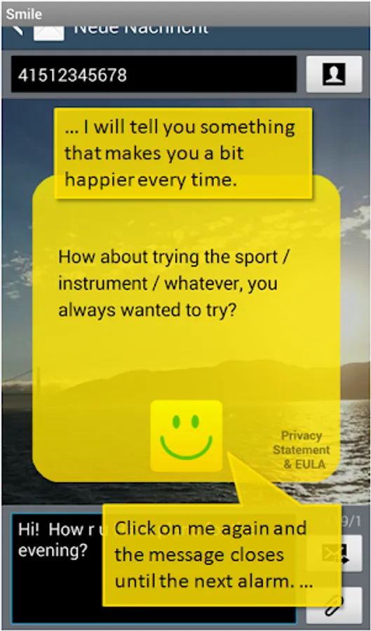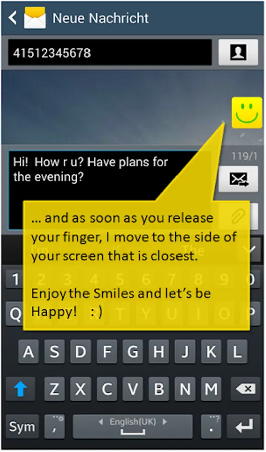 + The app launches up to 4 times per day in the form of a small hovering button (her name is Happy and she's smiling :) ). To move Happy, perform a swipe that is starting on the button. Then you can drag Happy wherever you want her to be. When you lift your finger, Happy moves to the closest border of your screen.