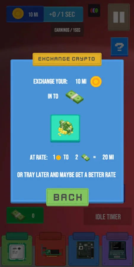 Become a crypto mining tycoon! Earn your fictional Crypto Currency in this fun incremental idle game. Strategize to sell your crypto currency for the best ratio on the market. The more and higher you sell the better Mining Rig upgrades you can afford. You can choose between CPU, GPU, Motherboard and Software enhancements.