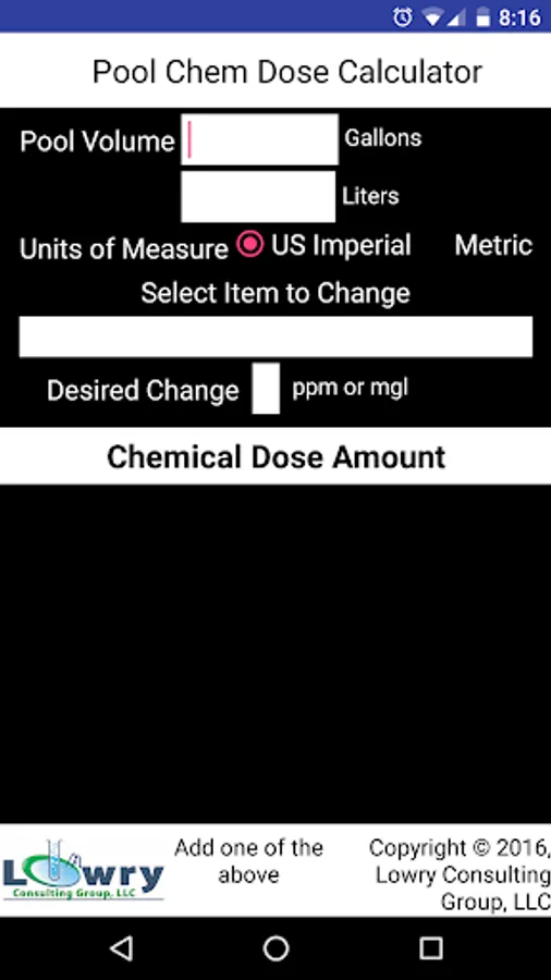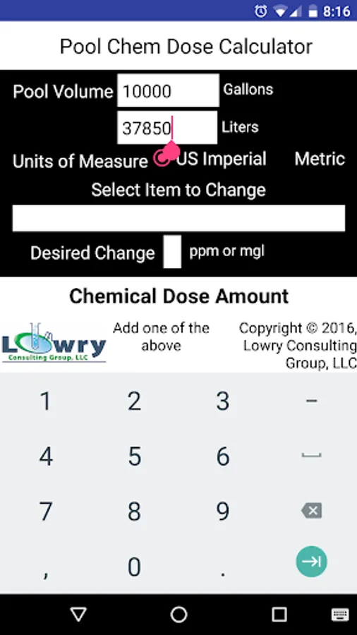 Pool Chem Dose Calculator will calculate the exact chemical dose needed for 38 chemicals in 11 categories for any size pool in US Imperial or Metric measures. To use it you enter the pool volume in gallons or liters, choose US Imperial or Metric, select which item you want to change from the drop down list and then enter the desired change in ppm or mg/l. Pool Chem Dose Calculator then lists all of the chemicals that can be used for that item change and the doses for each one. It only shows 3 chemicals on the screen. If there are more than 3 for an item, you can scroll down the list.