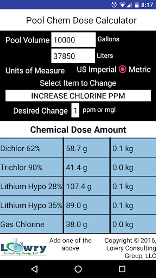 For example, if you want to Increase Chlorine by 3 ppm in a 14,750 gallon pool, enter 14750, select US Imperial, select Increase Chlorine from the drop down menu and enter 3.0 in ppm. Instantly see the amounts needed to get 3.0 ppm chlorine in that pool for 15 types of chlorine. Makes it easy to compare and see which might be cheaper to use or make a substitution.