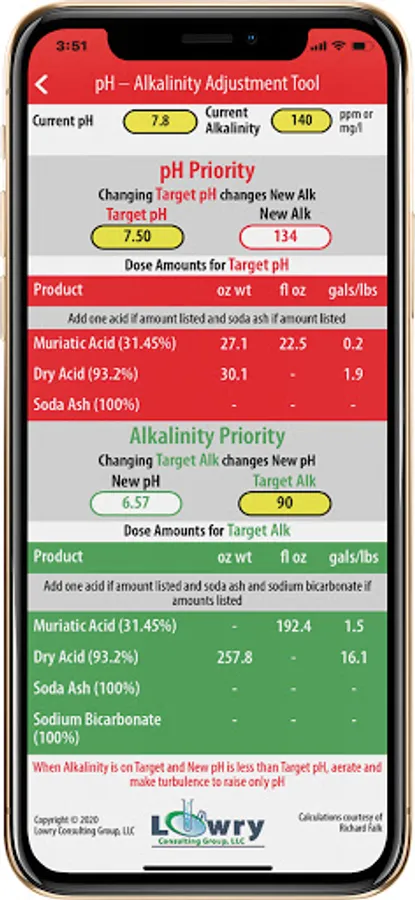 The pH – Alkalinity Adjustment Tool works for any current or starting pH and alkalinity, any CYA, any borate, any calcium hardness, any TDS, any temperature with any Target pH or alkalinity, and it works for raising or lowering both with an accuracy of 0.01. It is also much more accurate than the Pool Acid Dose Calculator because it uses all sources of hydrogen ion (H+) in the water.