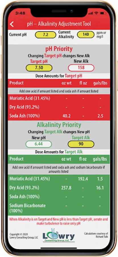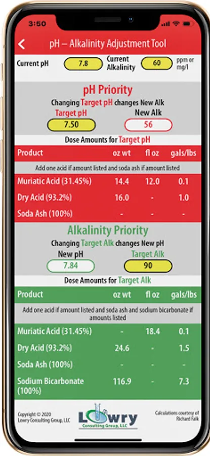 Now with the pH – Alkalinity Adjustment Tool, you input the pool volume and water conditions and it calculates the exact amount of chemicals to add to reach either a Target Alkalinity (and it provides you with a new pH) or to reach a Target pH (and it provides a new Alkalinity). We call this pH Priority and Alkalinity Priority.