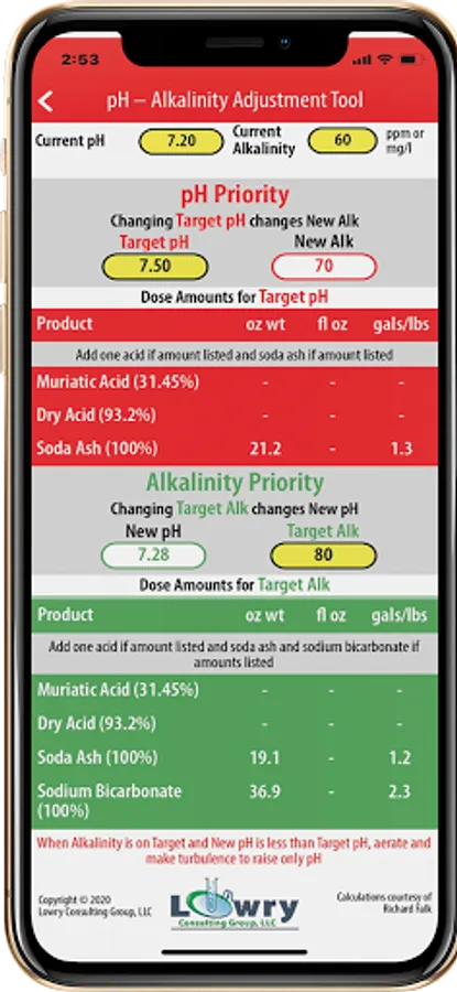So, you can choose whichever Priority you want – pH or alkalinity. You can also change Targets to see what it will do. The Conditions on Screen 1 can be changed also to see what effect they will have on pH and alkalinity. Changing any condition on screen 1 will change dose amounts and New pH and New Alk on screen 2.