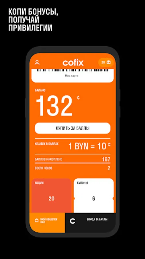 Check-in with every order (read the barcode at the checkout), get bonus cashback and other privileges of the Cofix Club loyalty program.