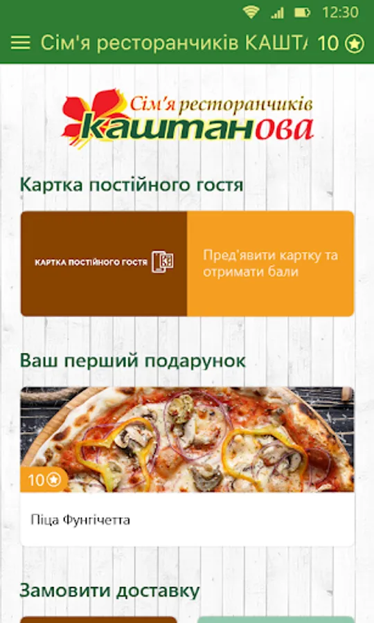 With this application, customers of the Chestnut Restaurant return 5% of the cost of ordered dishes in the form of points. Points are accumulated in the application. Having collected enough points, they can be exchanged for dishes from the menu and gifts.