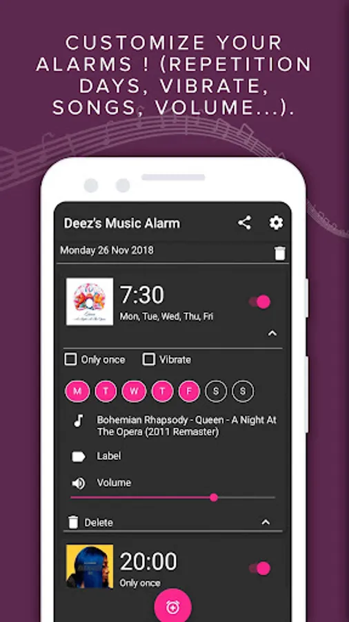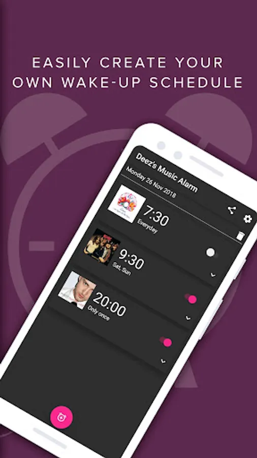 Set repeated alarms - Play your alarm every Monday, Thursday, Friday or other days. Forget about setting alarm again and again. Wakeup to new songs everyday powered by Deezer Music. Set specific songs for specific days. Sometimes having cool alarm clock sounds can set a positive tone for the whole day. The nice & customized repeat alarm clock can change the way you wakeup!