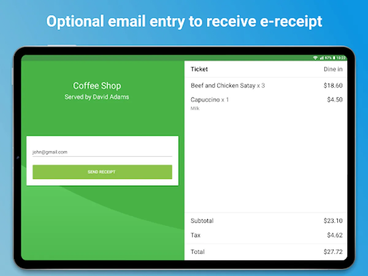 - Email Address Input: The display allows customers to enter their email addresses to receive digital receipts.