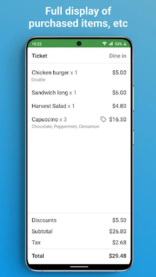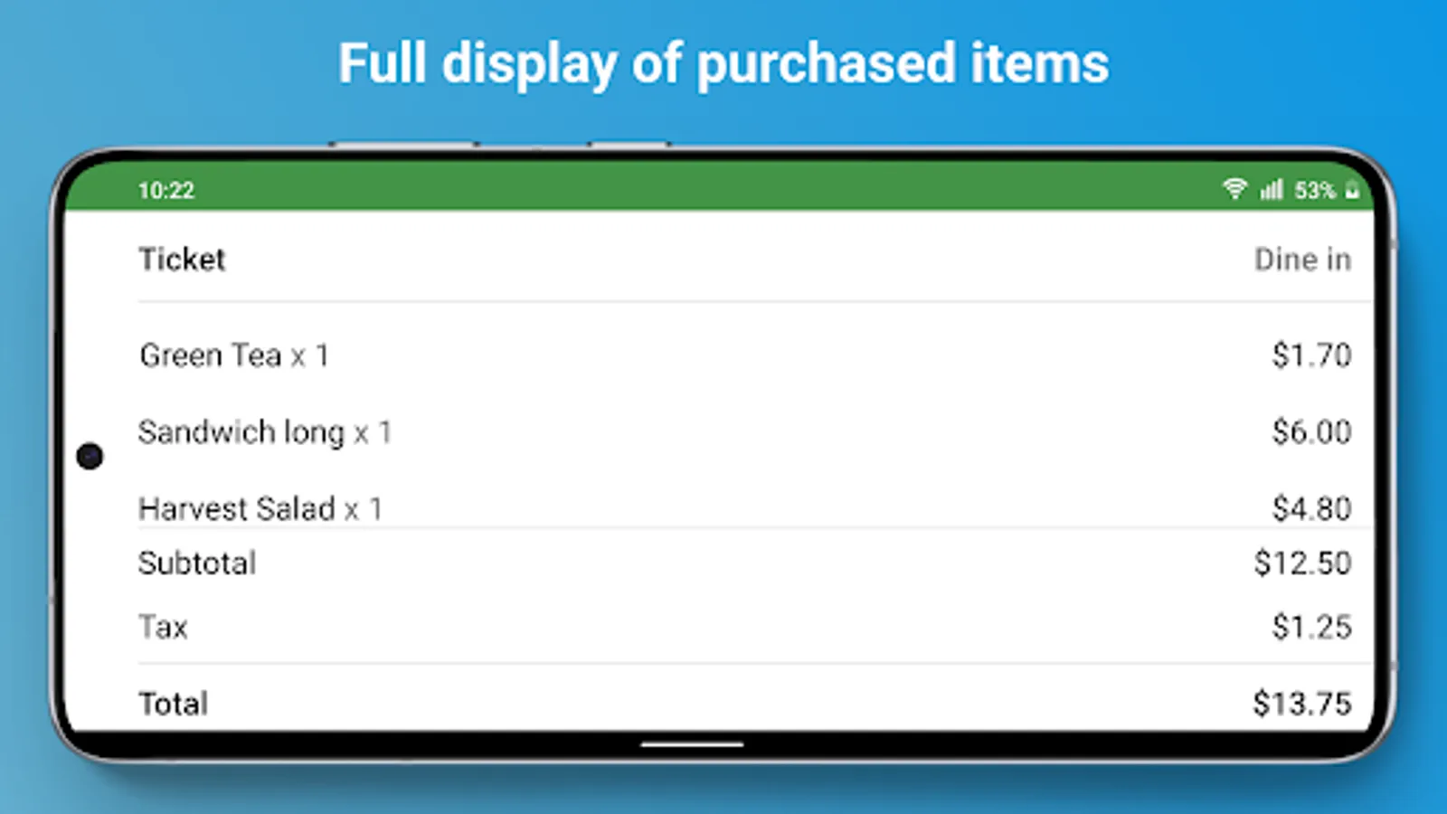 - Order Information: The display shows all the relevant details of customer's order, including items, taxes, discounts, and total amount due.