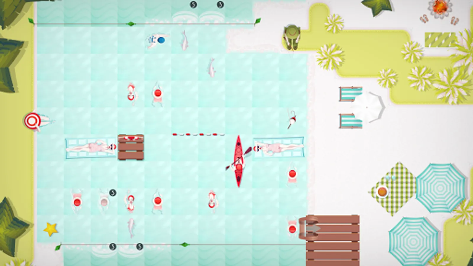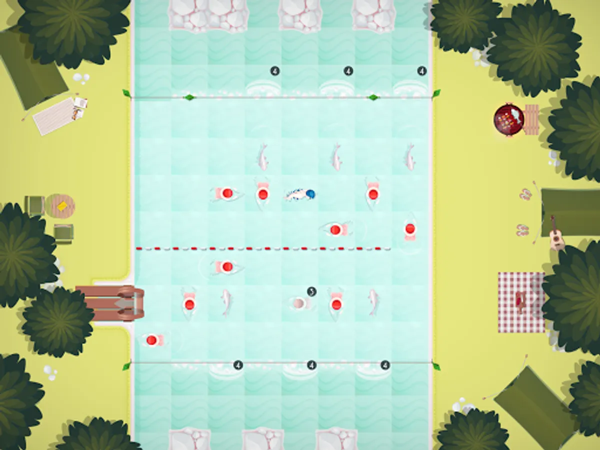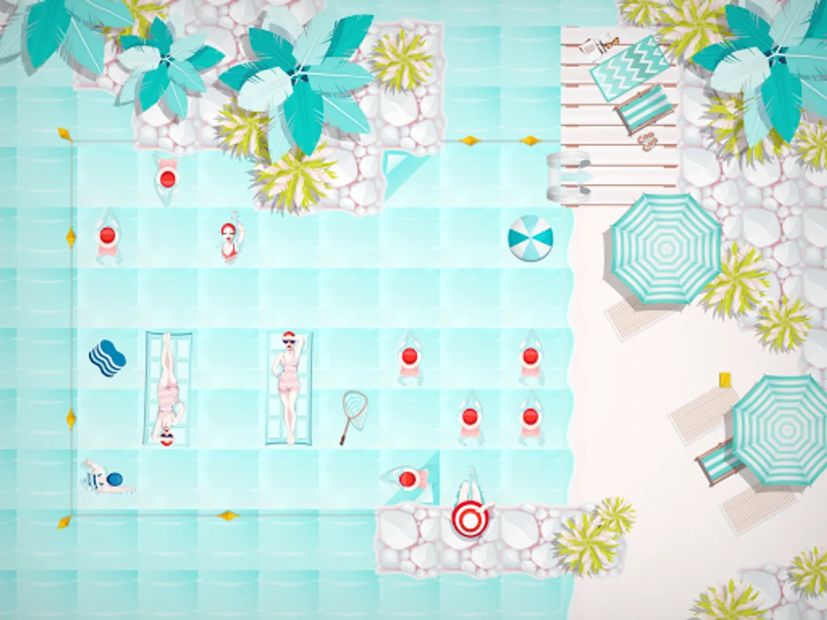 Dive into the relaxing and refreshing atmosphere of Swim Out, a strategic, turn-based puzzle game, that will transport you into a sunny day by the swimming pool, the river or the sea. Plan each of your strokes wisely and be sure to never cross any other swimmer's path if you want to peacefully enjoy the sea view on a cosy chaise-longue.
