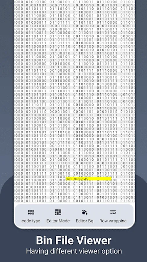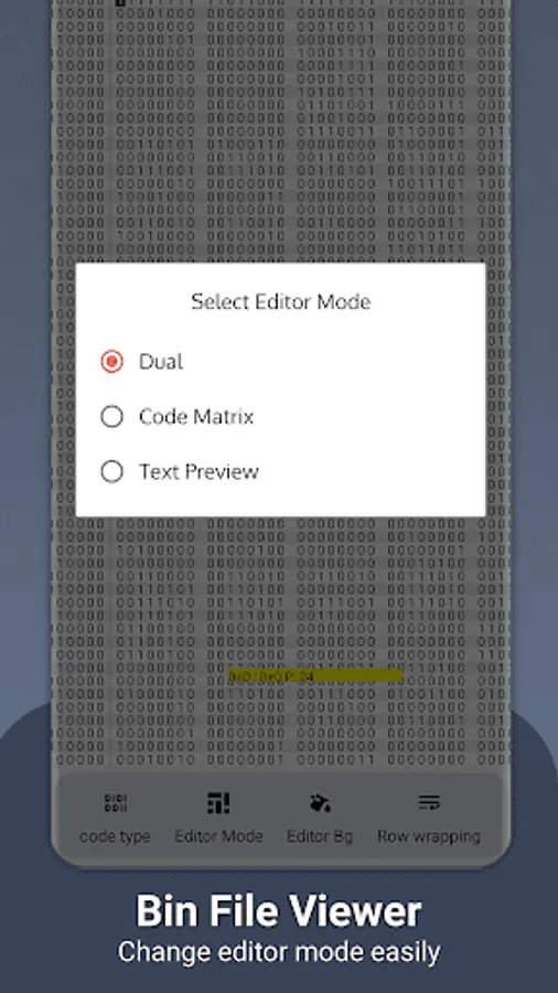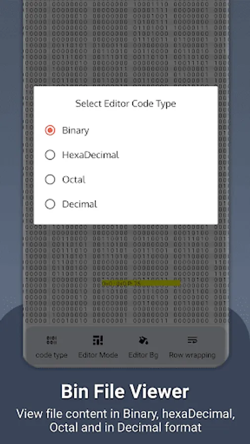 Bin viewer is a powerful tool that supports various types of code, including binary, octal, decimal and hexadecimal. Bin file opener allows you to view the content of any file in these formats. It also has three levels of editor mode: dual mode, where you can view the content in all four formats and the original one; code matrix mode which only shows the content in binary, octal etc.; and Text Preview mode which lets you view the document's text format.
