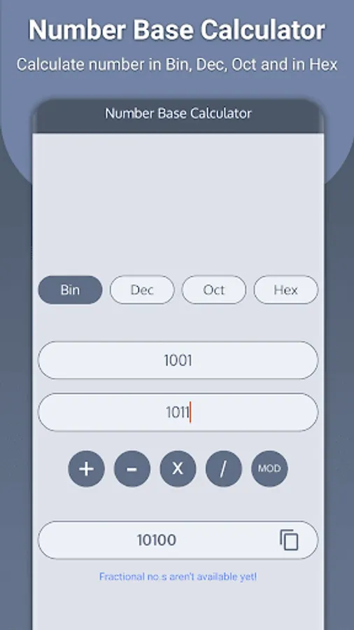 4. Base calculator: Perform arithmetic operations on binary, octal, decimal, and hexadecimal values with ease.
