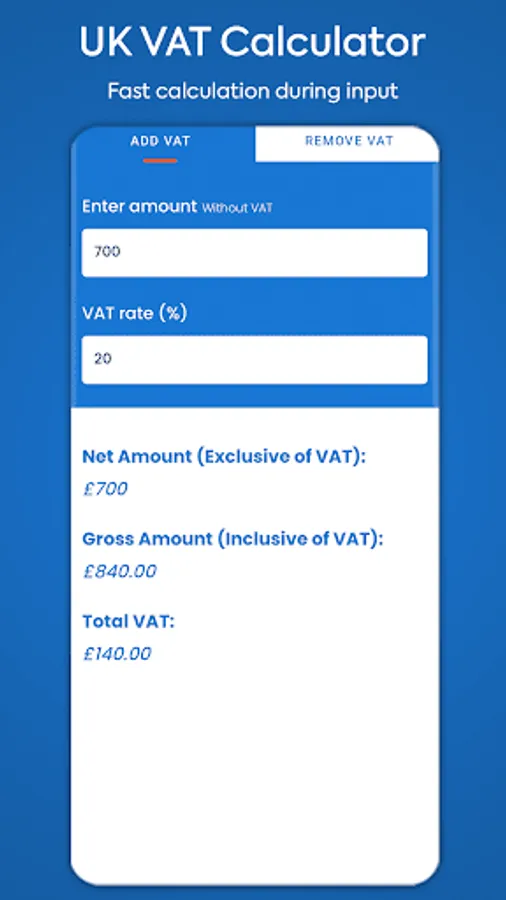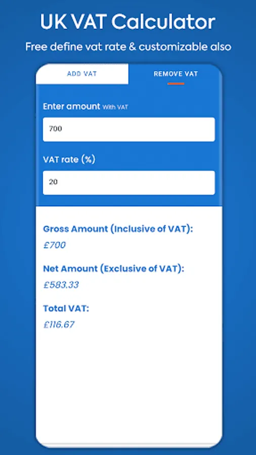 In addition to its simplicity, our app offers flexibility. You can set custom VAT rates to accommodate specific situations. This feature ensures that you can calculate VAT accurately, even when dealing with unique tax rates or circumstances.