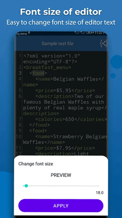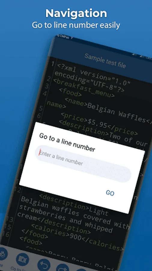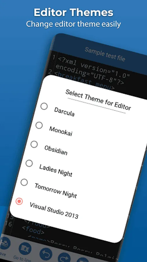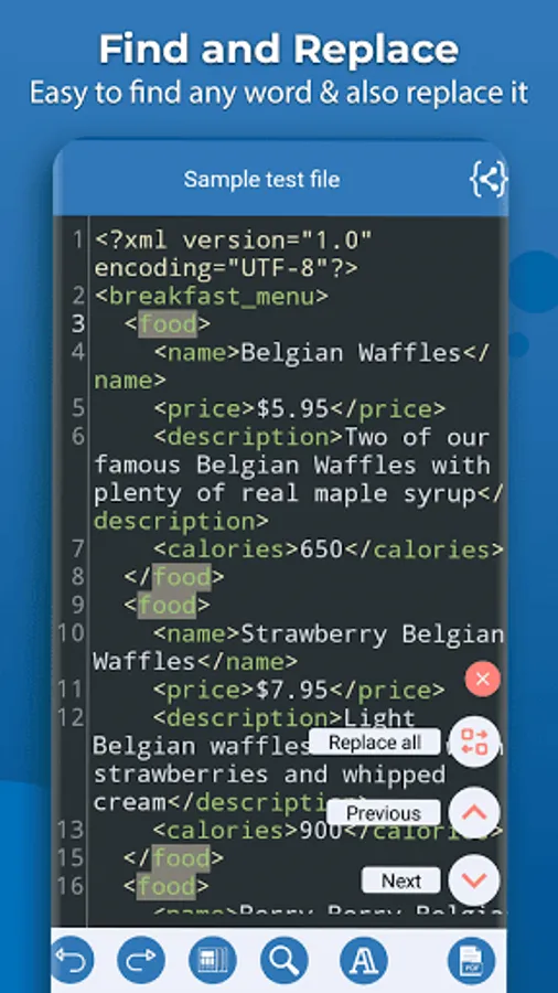 Through xml editor you can easily undo and redo the code easily and can easily navigate to a specific line number. In xml editor you can easily search for any word and also easily replace all find result with any other word. Xml Viewer have different theme which you can easily apply to editor. In xml reader app you can easily change editor font size.