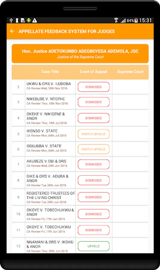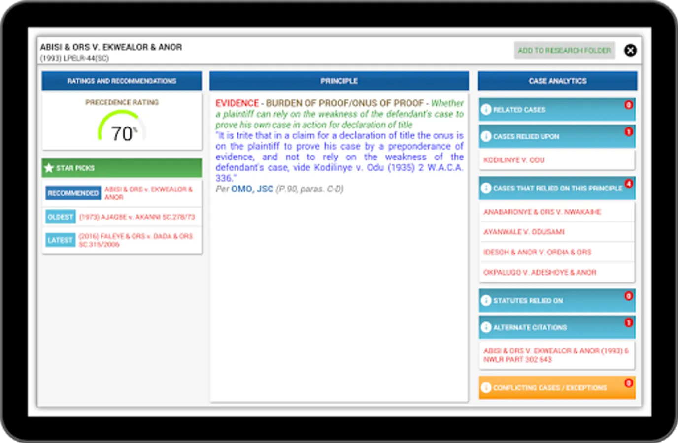 LawPavilion Prime gives you analysis of the strengths and weaknesses of legal positions and authorities you or your opposing counsel rely on by generating a never before seen statistical analysis, historical data, precedential value ratings, conflicting judgments, locus classicus, statutory and literary authorities and opinion, judicial standpoints of presiding judges and so many other compendium of computer generated intelligent information on such authorities.