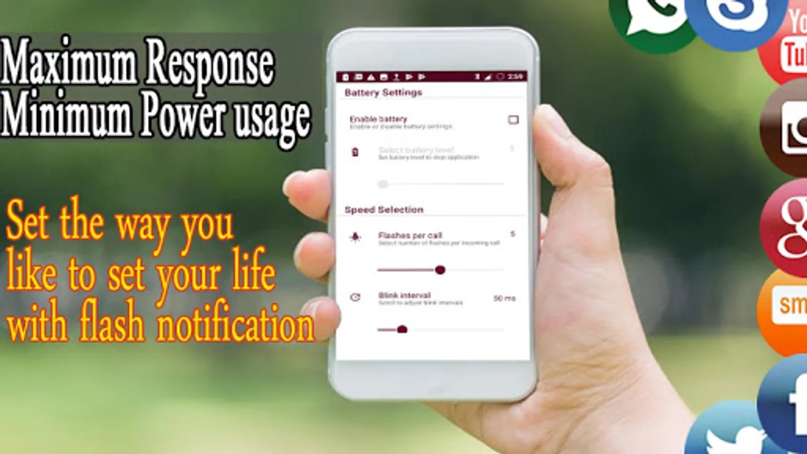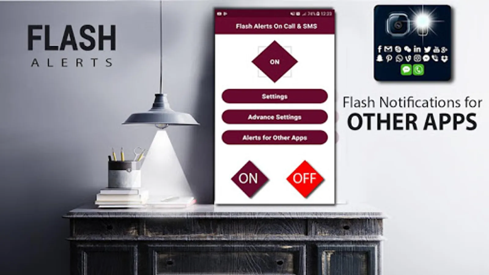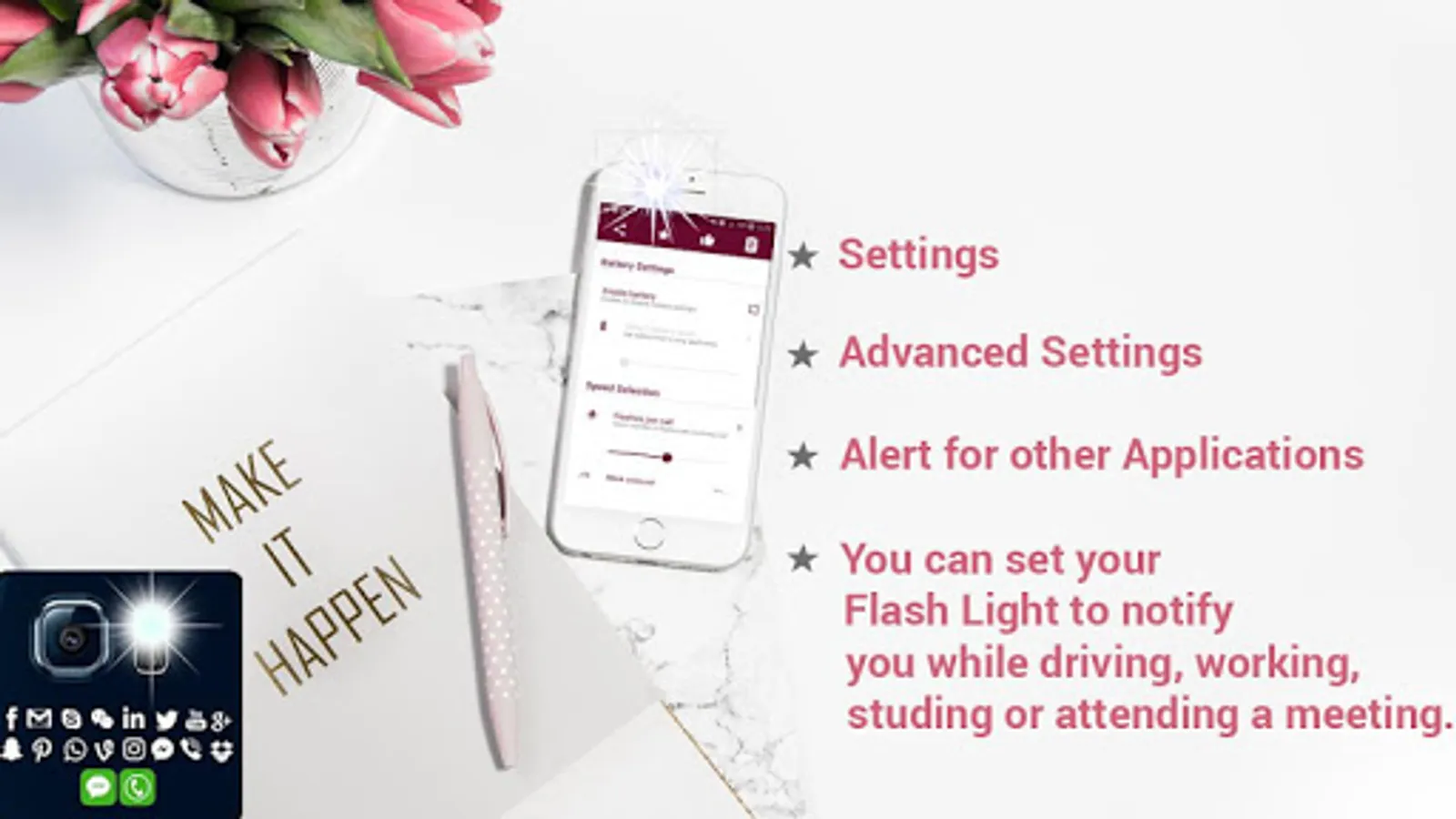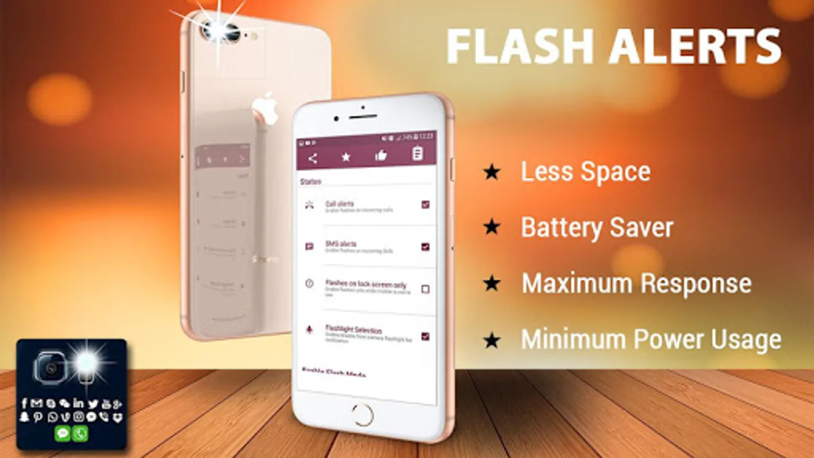 ★ Flashlight alerts for incoming sms and social application notifications.