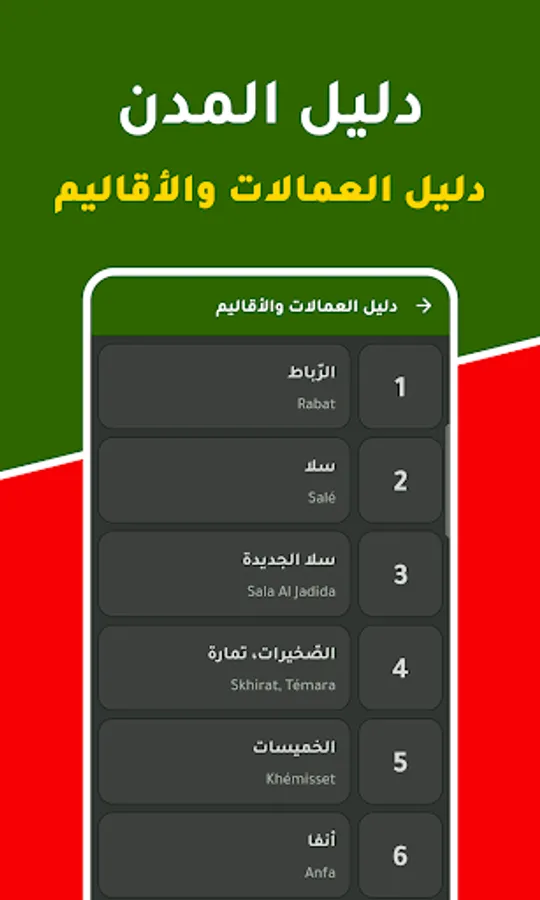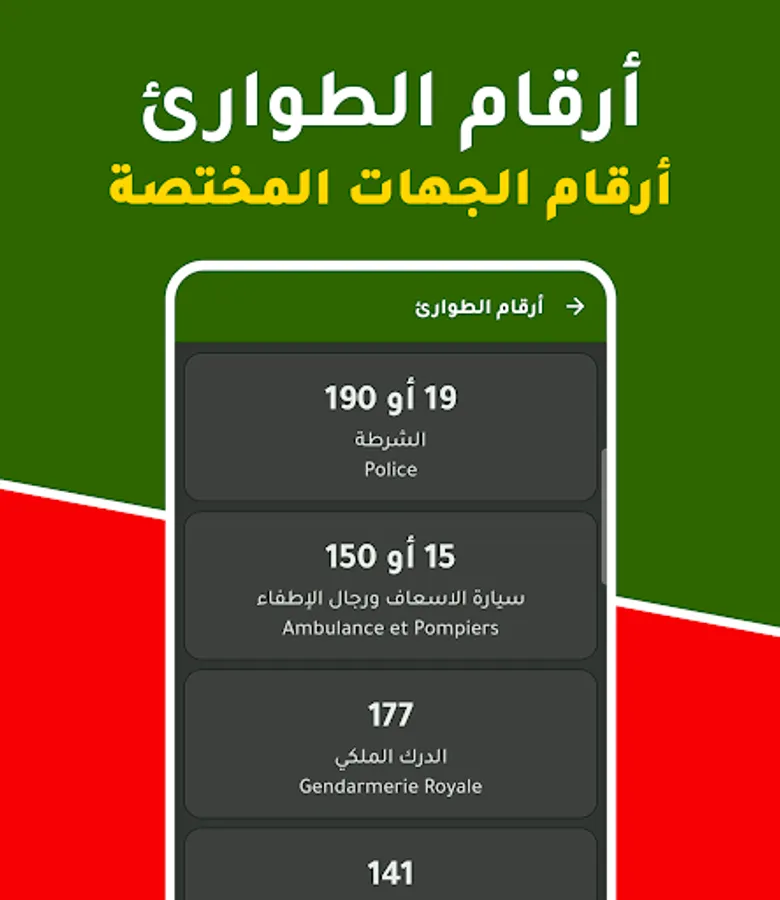 ■ Emergency numbers: A directory of the numbers of the competent authorities in Morocco, such as the police, civil protection, and the ambulance.