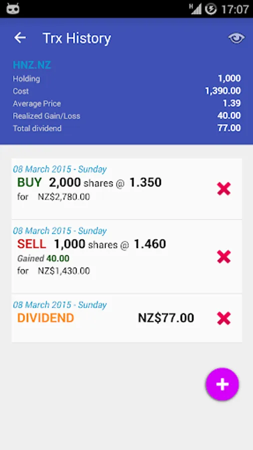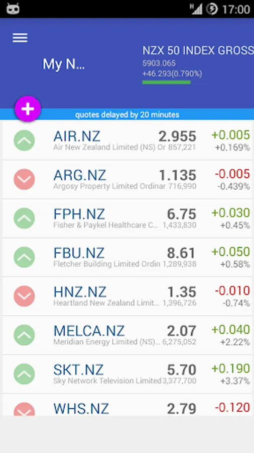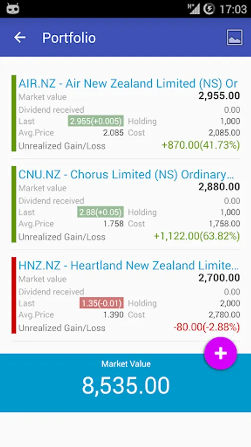 My NZX allows you to monitor and manage your portfolio for New Zealand Stock Exchange, NZX in your mobile phone. It features an easy to use interface with the latest Lollipop material design layout; it lets you manage your portfolio at a glance with quick summary info plus wealth of market related information. Free and no registration required, all user's data are stored locally on your phone.