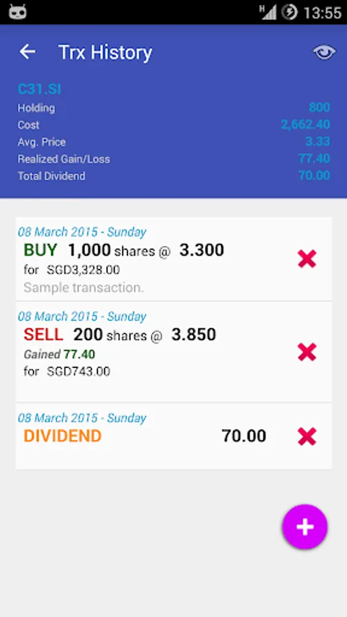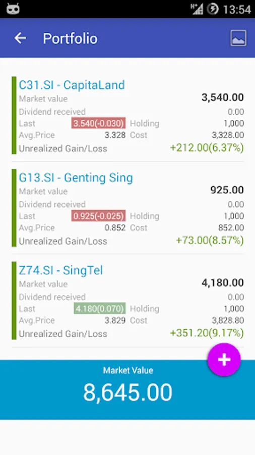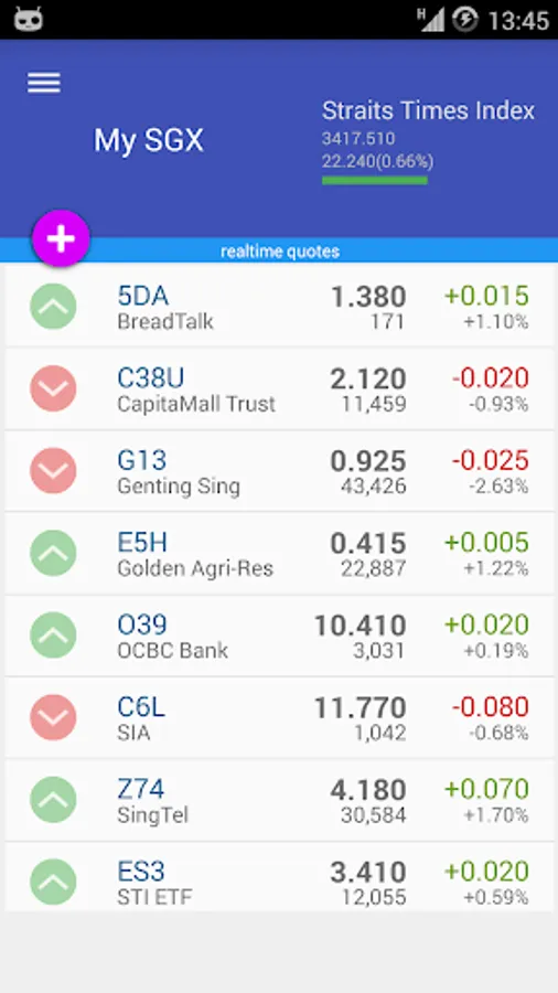 My SGX allows you to monitor stock prices from SGX (Singapore Exchange) in your mobile phone. It features an easy to use interface with the latest Lollipop material design; it lets you manage your portfolio at a glance with quick summary info plus wealth of market related information. Free and no registration required, all user's data are stored locally on your phone.