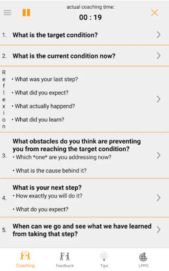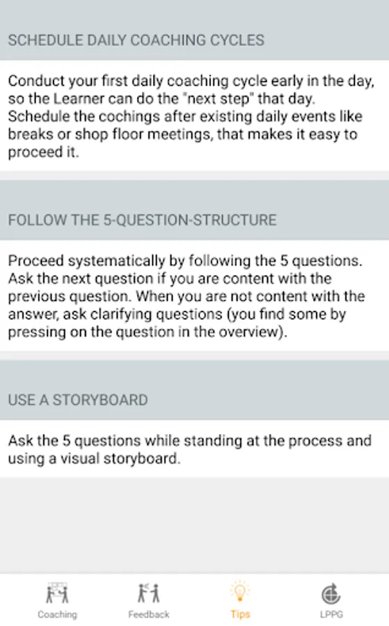 With the Coaching-Kata-App you can practice easily the 5-question framework of Coachingkata.