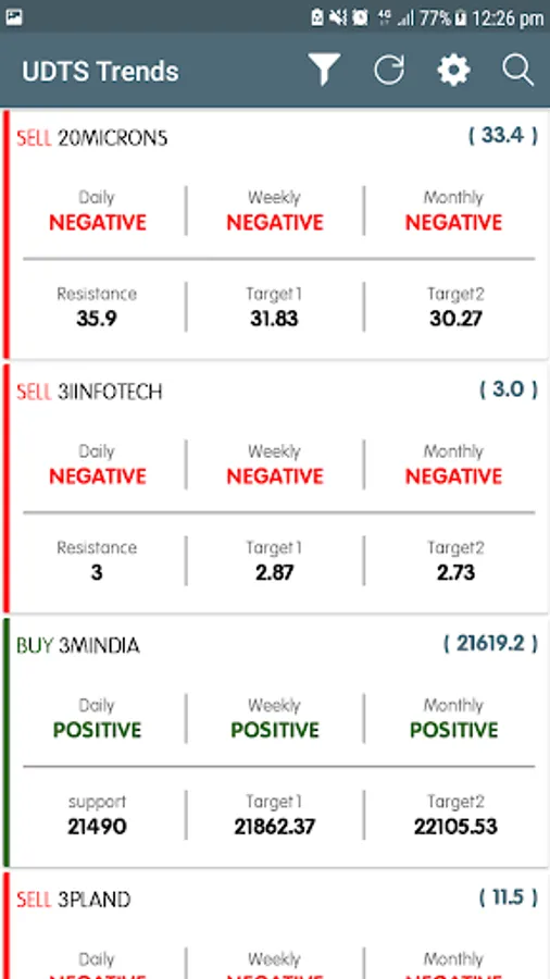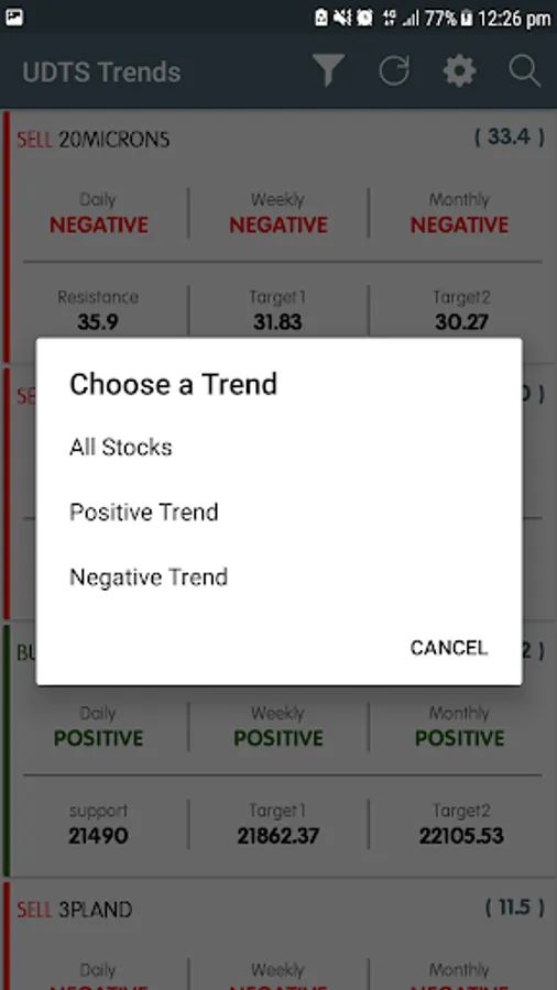 - User can filter from all favourite stocks ONLY POSITIVE trend stocks means stock with BUY signal and ONLY NEGATIVE trend stocks means stock with SELL signal.